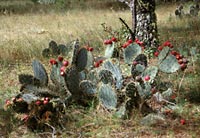 Opuntia lagunae CACTACEAE (Familia: Cactus) El nombre genérico se refiere a Opus, una antigua ciudad griega que, se cuenta, tenía "una planta de tipo espinoso que crecía en las afueras". El epíteto específico se refiere al lago o "laguna" que está en la parte superior de la sierra de La Laguna que es el área a la que se restringe esta especie. Otro nombre común es el de "tuna morada", una referencia en español al color de su fruto. DescripciónEste cactus pertenece al grupo de nopales del género Opuntia y crece aproximadamente 1 m (3 pies) de altura. Los tallos están aplastados y tienen la forma ovalada típica de las pencas de muchos nopales. Las pencas son gris-verdoso y de color lechoso. Las espinas blancas tienen 3 cm (1-1/4 pulgadas) de largo. Las flores tienen pétalos amarillos de aproximadamente 7 cm (casi 3 pulgadas) de ancho. El fruto es de 7 cm de largo y de color rojo vivo. Es de sabor muy dulce. Rango y HábitatEste nopal está restringido únicamente a una sola cadena montañosa en Baja California Sur en la parte más alta de la sierra de La Laguna. Crece aproximadamente a 2000 m (6600 pies) de elevación. |
